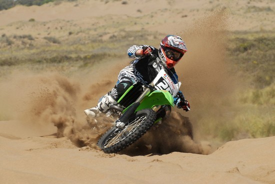 Ver surcar la YZ450F sobre la cresta de los pozos, acelerar en la subida a los médanos, era simplemente espectacular. Desde que se levantó la banda elástica que señalaba la partida comenzó con un ritmo demoledor que fue imposible para ninguno de los demás poder seguir. Sebastián Sánchez en el principio se mantuvo relativamente cerca, pero las diferencias vuelta tras vuelta fueron indescontables para el piloto oficial de Yamaha Motor Argentina con la moto que atiende Maneco Molinari. Por el lado de Sánchez, se notaba que venía muy rápido pero con una transmisión demasiado corta ya que el motor venía con más vueltas (rpm) que la de Ellis, y con la rueda trasera “mas nerviosa” en la Kawasaki del pampeano volador. Igualmente mas que meritorio verlo a Sebas Sánchez corriendo estas carreras, sin haber entrenado en este circuito y dando batalla.