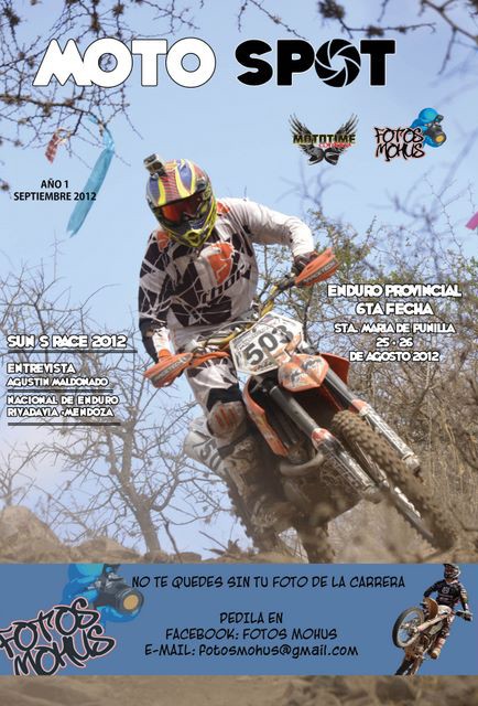 En un emprendimiento altamente positivo, el enduro cordobés tendrá su revista de tirada mensual con material fotográfico, periodístico e informativo del campeonato mediterráneo, uno de los mas importantes del país hoy por hoy. La iniciativa está a cargo de Andrea Balangione de Foto Mohus, que recibirá la colaboración de MOTOTIME para la realización de MOTO SPOT, una revista mensual de distribución gratuita, que en esta primer etapa, tendrá una tirada de 1000 ejemplares distribuidos en los principales comercios del ramo “motoquero” previo a las competencias oficiales, y en las mismas los fin de semana de carrera.