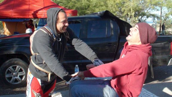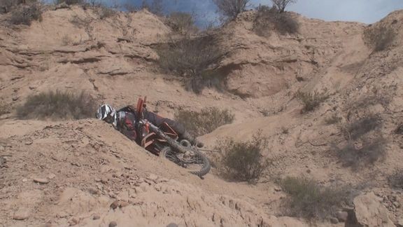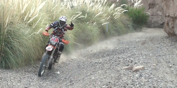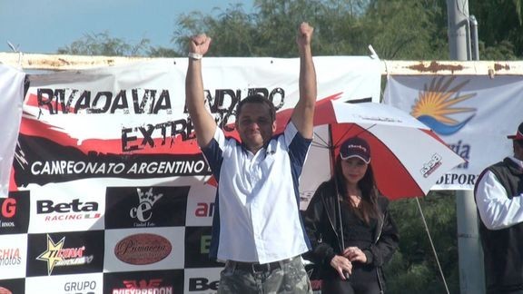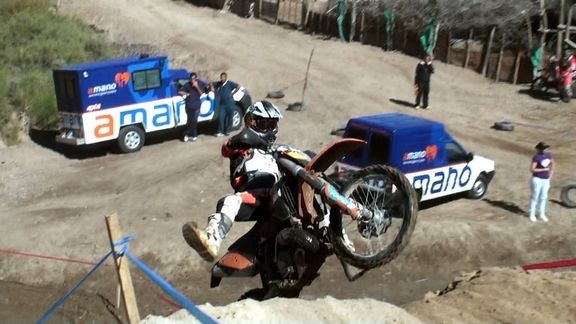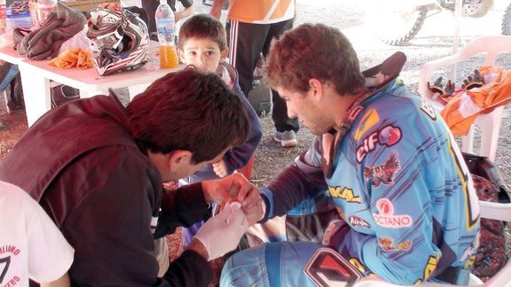 El doctor Pablo Bratanich (Husaberg Argentina) demostrando que un tropezón no es caída.