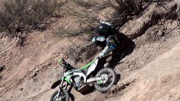 La bajada extrema del Enduro Test llevó a este piloto a querer bajarla con la moto al lado… Nuuuuuu!!!!