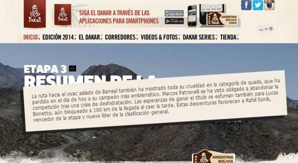 Desde un primer momento las razones del abandono de Marcos Patronelli, aparecieron como versiones distintas. Mientras en la página oficial Dakar.com (Foto 1), daban cuenta de la deserción del doble ganador de la carrera en Quads, desde su entorno y porteriormente en declaraciones propias, Marcos afirmó que se trato de un problema de potencia de la máquina que se tradujo a posteriori, en un desbarrancamiento del mismo sin que el pudiera hacer nada para salvar su máquina de la destrucción.