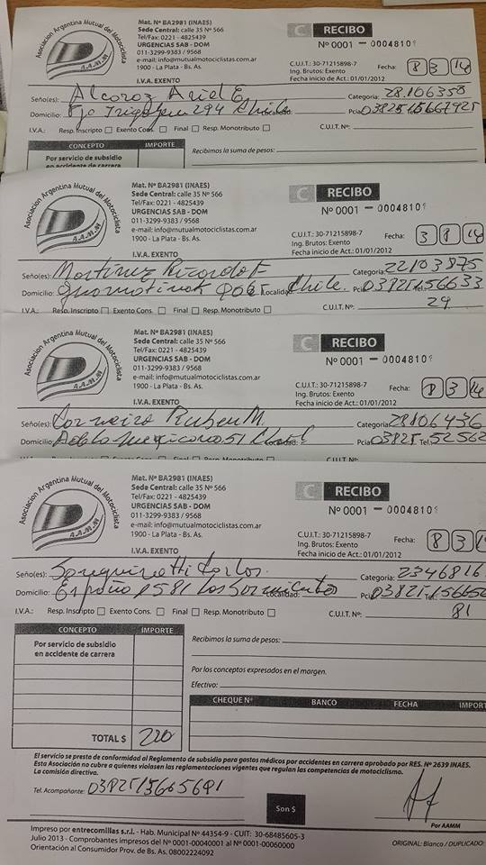 “Amigos quería mostrarles una de las tantas irregularidades que tenemos q sufrir en la rioja con el delegado de camod y presidente de la federación rioja de motociclismo. En la carrera q se corrió en sañogasta ciudad de chilecito sufrimos una estafa con los seguros médicos. Como podrán observar en la foto los 4 recibos tienen el mismo numero y corresponden a distintas personas. Así mismo las pulseras q nos entregaron no tenían el numero de referencia del recibo ni impresión alguna. Me tome el atrevimiento de hacer esto para que se terminen de una ves los negociados y las estafas a los pilotos que somos quienes hacemos el esfuerzo para poder correr cada carrera. Saludos.”