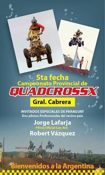 El fin de semana se definirá el campeonato Apertura 2014 del Quadcross X en la localidad de General Cabrera, este certamen que desde su creación a despertado la pasión de los pilotos de Quads en pistas simil motocross, llevado adelante en la promoción por Cristian Farías, el hijo del recordado “Bigote” y fiscalizado por la FCM. En la categoría PRO, la definición será apasionante y al detalle, ya que el piloto local Juan Covassin adelanta por tan solo una unidad a Catriel Altamirano (HyL), quien ha ganado las 2 últimas carreras contando con ese envión a pesar de estar detrás en las posiciones.