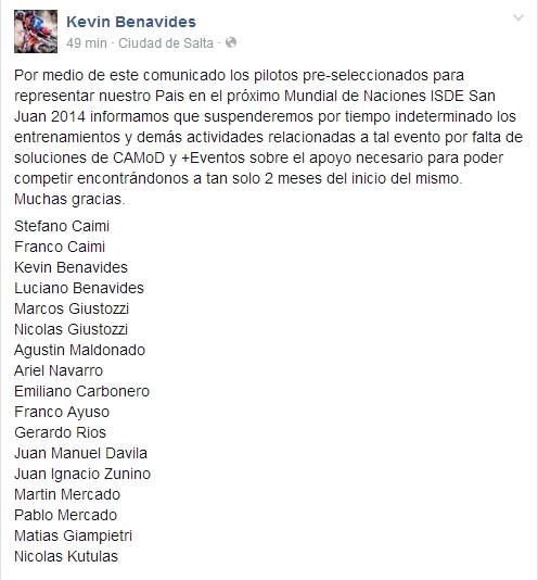 Este es el comunicado textual del facebook de Kevin Benavides pero replicado en las cuentas de todos los pilotos que tienen una: