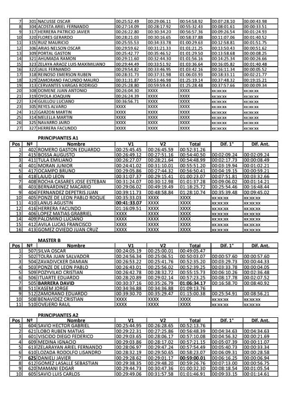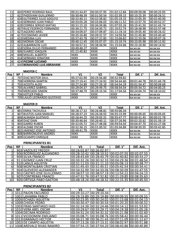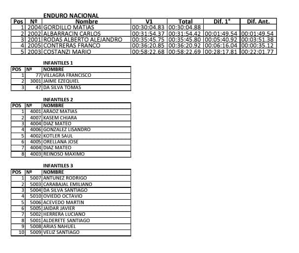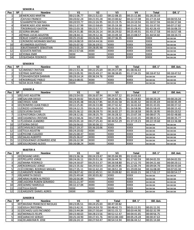 En Seniors B Cristián Jimenez fue el ganador, Agustín Livio en Júnior A, Ariel Rojano en Master A, Francisco Mudad en Júnior B, Gastón Romero en Principiantes A1, Oscar Silva en Master B, Héctor Savio en Principiantes A2, Néstor Díaz en Master C, Hugo “Tachuela” Enría en Master D, Freddy Vázquez en Principiantes B1, Facundo Pajón en Principiantes B2, Matías Gordillo en Enduro Nacional, Francisco Villagra en Infantiles 1, Matías Araoz en Infantiles 2 y Rodrigo Antunez en Infantiles 3.