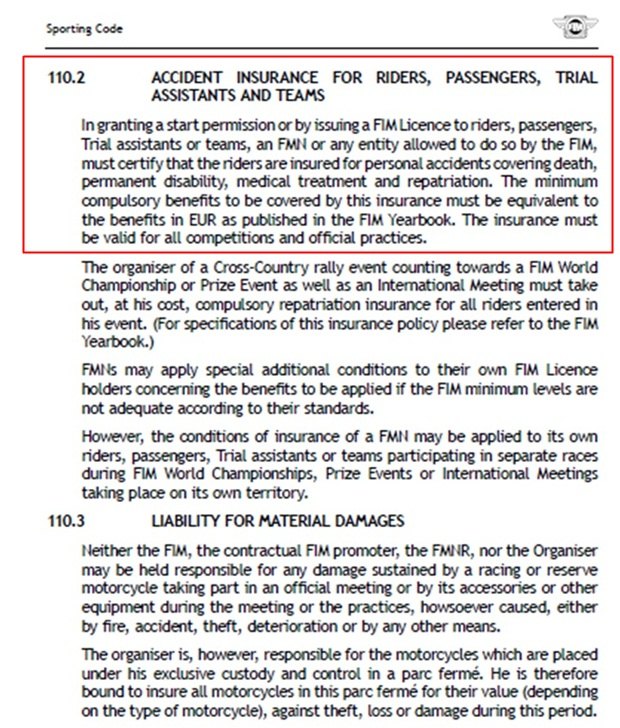 Consultada una alta fuente de la FIM que pidió mantener su identidad en reserva de momento, la misma confirma que es la CAMoD, en su condición de Federación Nacional única (FMN) y a la vez quién otorga las licencias correspondientes, la responsable de certificar que el piloto licenciado cuente con el debido seguro de accidente personal, que cubra muerte, discapacidad permanente, tratamiento y repatriación, en montos especificados debidamente en el código deportivo de la Federación Internacional del Motociclismo (ver foto párrafos enviados). Más allá de lo que rezan los códigos deportivos y las responsabilidades que se desprendan del mismo, a más de dos semanas de finalizado el evento, el piloto mendocino aún no ha recibido respuesta ni comunicación alguna oficial según el mismo asevera, lo que llevaría esta situación a un conflicto legal.