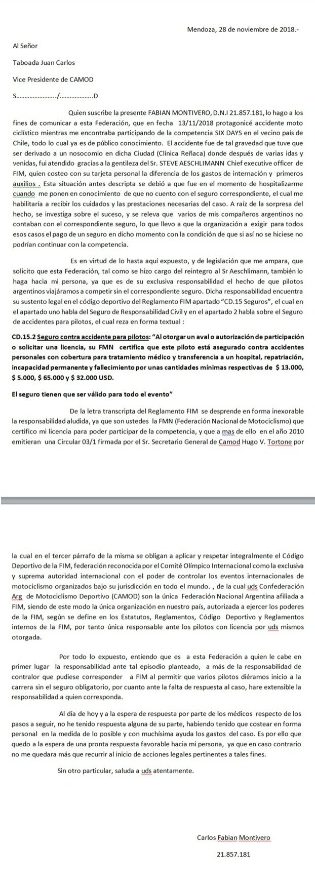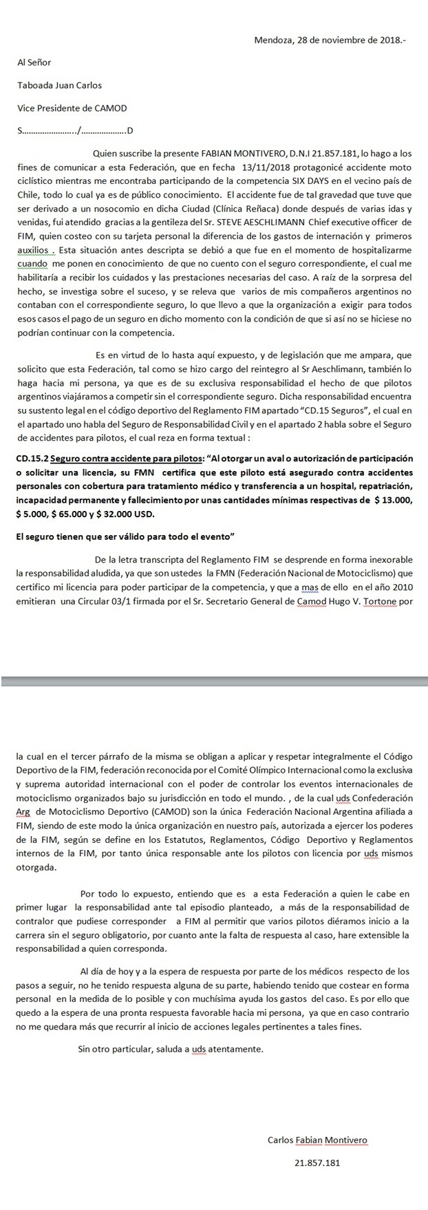 En una carta envíada a CAMoD y que nos llega a nuestro medio, el piloto mendocino reclama a CAMoD la responsabilidad sobre el hecho poco menos que increíble, de encontrarse disputando un mundial de enduro en Chile, sin cobertura de seguro para deportes de alto riesgo, responsabilidad que según lo expuesto en la misiva, le correspondería en primer término a la Confederación Argentina, ya que a la hora de extender la licencia deportiva internacional correspondiente, también sería deber del ente madre del motociclismo nacional, el de corroborar al menos, que cada piloto cuente con la debida cobertura médica de accidentes, según se desprende del artículo citado del código deportivo FIM enunciado.