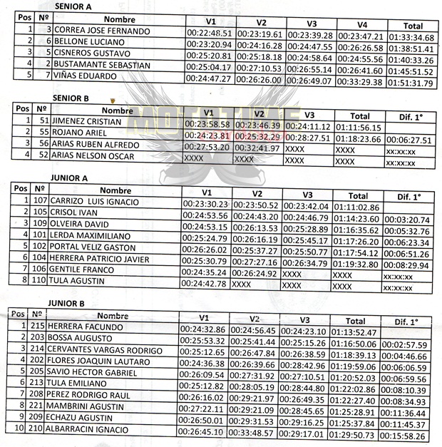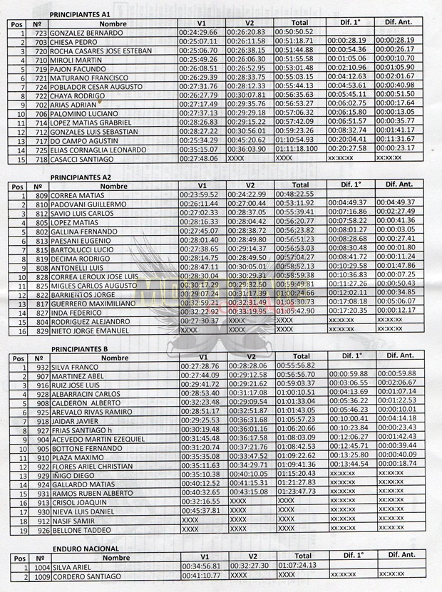 Luego, las clases Principiantes salieron a escena, ya con clima que comenzaba a apretar un poco, aunque el circuito apretaba y no ahocaba, merced a su innumerable cantidad de cruces de río y sendas oscuras por la abundante vegetación catamarqueña. Allí Bernardo González se quedaba con el triunfo en A1, Matías Correa lo hacía en A2, Franco Silva subía a lo mas alto en Principiantes B y Ariel Silva prevalecía en Enduro Nacional.