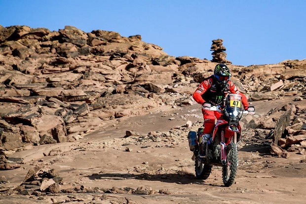 El español Joan Barreda (Honda) vuelve a hacer gala de condición de piloto ganador de etapas, al lograr la número 27 en su historial de 10 participaciones dakarianas, en una etapa que hoy fue recortada en 100 kms. por demoras en el día de ayer. Sin embargo el australiano Toby Price (KTM) hoy séptimo, es quién llega al día de descanso como líder de la general, teniendo como escolta a nuestro Kevin Benavides (Honda), que hoy abriendo camino tras ganar ayer, firmó 17º a 9’53” del ganador, un resultado más que esperable y aceptable para quién debe salir al desierto sin marcas algunas para seguir. Franco Caimi (Yamaha) hoy ha sido el mejor argentino en el 13º lugar a 7’53” de Barreda, mientras Luciano Benavides (Husqvarna) es 16º a 9’29” de Bang bang.
