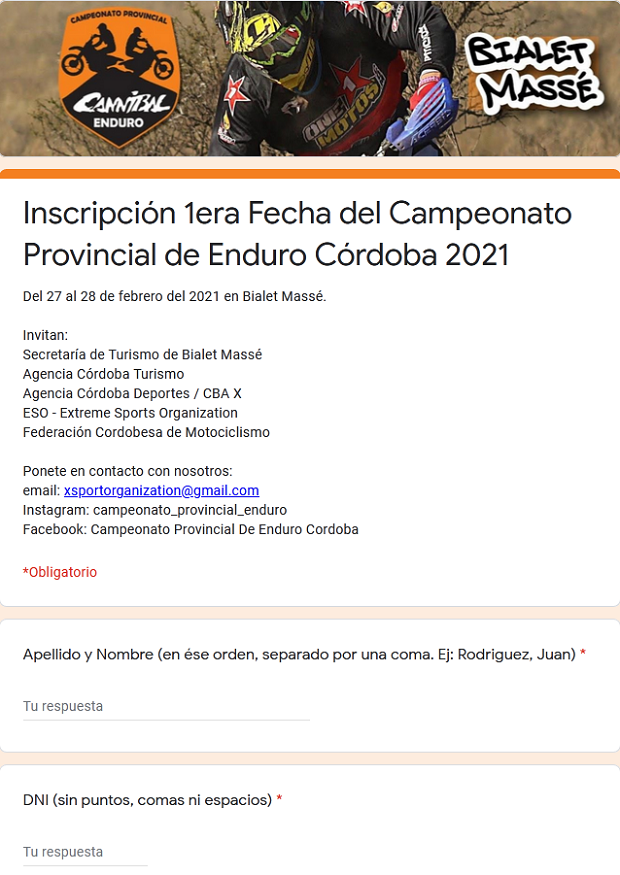 La organización del Campeonato Provincial de Enduro de Córdoba, comunicó que será fundamental que los pilotos que tengan intenciones de participar del regreso del certamen en Bialet Massé el próximo fin de semana, realicen la preinscripción online en el siguiente apartado Formulario Bialet Massé para así agilizar las administrativas y cumplir con protocolos de distanciamiento social en la pista, donde se deberá completar el trámite, pero ya de forma mas simple. Para comenzar la pre inscripción, hace click AQUÍ