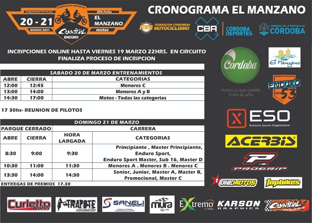 Comenzó la cuenta regresiva fina para la 2º fecha del Provincial Cordobés de Enduro en El Manzano, quedando abiertas ya las pre inscripciones en el siguiente link PREINCRIBIRSE AQUÍ dado que este paso es fundamental hacerlo, en cumplimiento de los requisitos del COE para evitar juntar gente en el proceso y acelerar los pasos administrativos. En cuanto a lo deportivo, la fecha en el trazado de la Agrupación E53 será estratégica, ya sea para confirmar buenos arranques del debut, como para revanchas en los casos donde las cosas no resultaron tan bien. Te adelantamos la información ya disponible, ya que será evento de Full Cobertura MOTOTIME ARGENTINA.