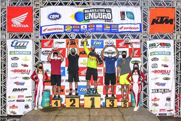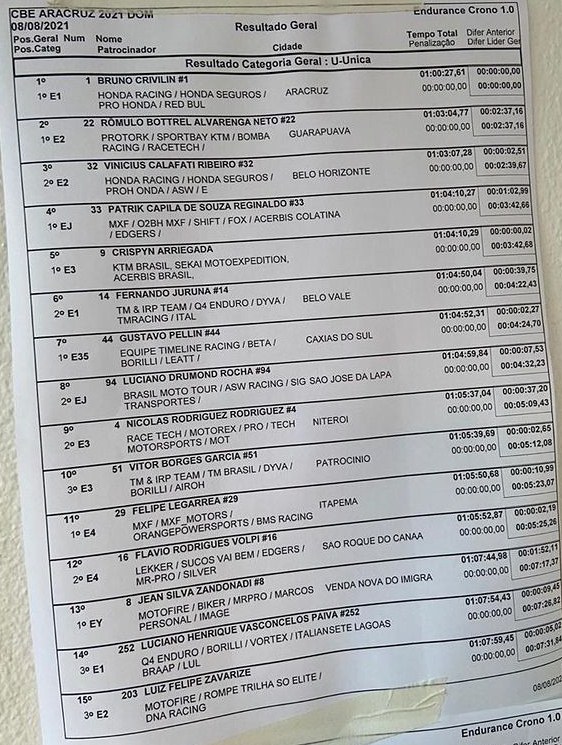 Fue una carrera el sábado y otra el domingo, con 3 especiales, Enduro test, Cross test e extreme test. Yo corrí con la moto que Ktm me da para ir a las carreras de Hard Enduro, a la que prácticamente no le cambié nada, solo las cubiertas que eran ultra soft para hard, después la suspencion muy blanda, la carburación diferente y la relación también para Hard. Quise correr así para ya adaptarme a la moto para el Hard enduro. Si bien tocó mucha lluvia durante el fin de semana, podría decir que partes del enlace eran bien Hard Enduro por la lluvia que cayó. Corrí en la categoría E3, y el primer día largue 40 porque no estaba en el ranking del campeonato. Eso me dificultó un poco en algunas especiales que tuve que pasar algunos pilotos, así y todo gane en mi categoría y quede 6º en la general. Para el Domingo largué en la 6º posición y conseguí ganar 8 de las 9 especiales en mi categoría y metí muy buenos tiempos en la general. En la especial Enduro y extrema metí un 3º y 2º en la general y en la de cross ahí mis tiempos no fueron muy buenos. Me sentí bien fuerte físicamente y mentalmente a pesar de que hace 1 año y medio que no tenía carreras por lá pandemia, esto fue posible Gracias a KTM Brasil y Sekai moto expedición. Ahora a seguir por este camino para arrancar el campeonato de hard enduro en septiembre, siempre agradeciendo a mis patrocinadores Acerbis Brasil, IMS Racing, BMS Racing, Motoart adesivos, Kenda, KTM Brasil, Sekai moto expedición, The doctor Bariloche, cómo a las personas que me envían mensajes de buena onda por allá”