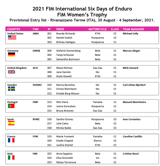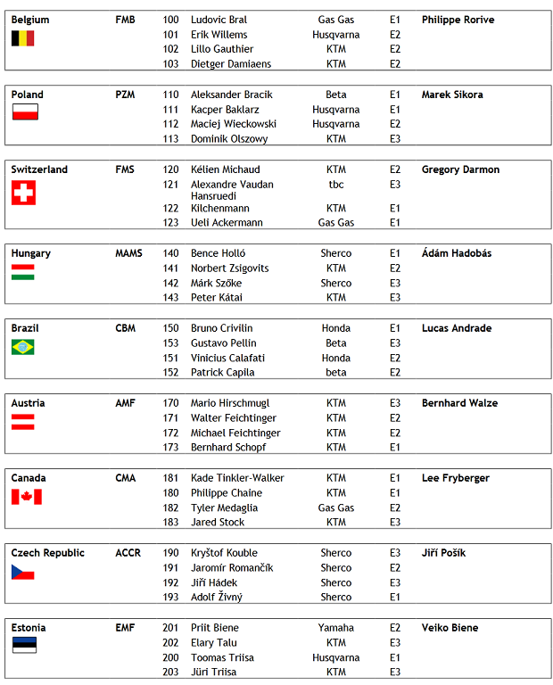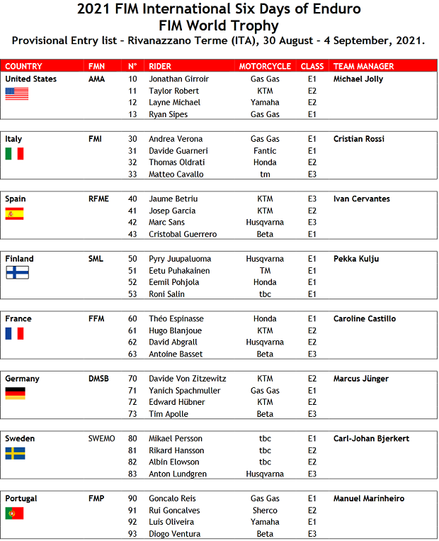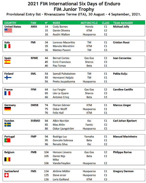 Por el trofeo mayor, Estados Unidos buscará retener el título conseguido en Portugal 2019, en este caso con una formación de temer a cargo de la gran revelación del GNCC XC2 Jonathan Girroir (GasGas-E1), Michael Layne (Yamaha-E2) y los experimentados Taylor Robert (KTM-E2) y Ryan Sipes (GasGas-E1), todos dirigidos por Michael Jolly. Los locales, salen también con una formación compacta, a cargo de Andrea Verona (GasGas-E1), Davide Guarneri (Fantic-E1), Thomas Oldrati (Honda-E2) y Matteo Cavallo (TM-E3), dirigidos por Cristián Rossi, mientras Francia y España, aparecen como los posibles equipos para meterse en la discusión por el título también, tras la baja de último momento del equipo británico y sus dos campeones del mundo, Holcombe y Freeman, sumado a Australia que por inconvenientes de traslado por restricciones Covid, decidieron pasar de largo la edición.