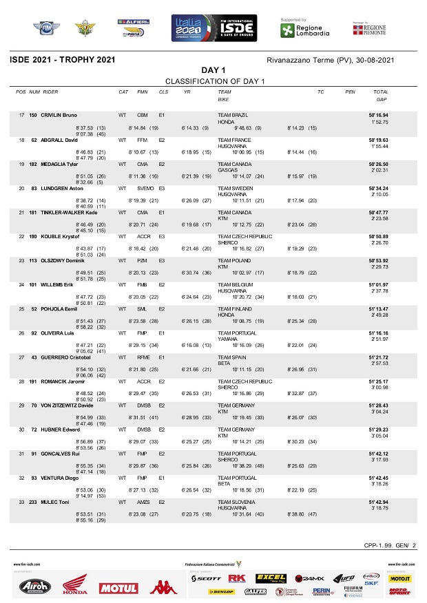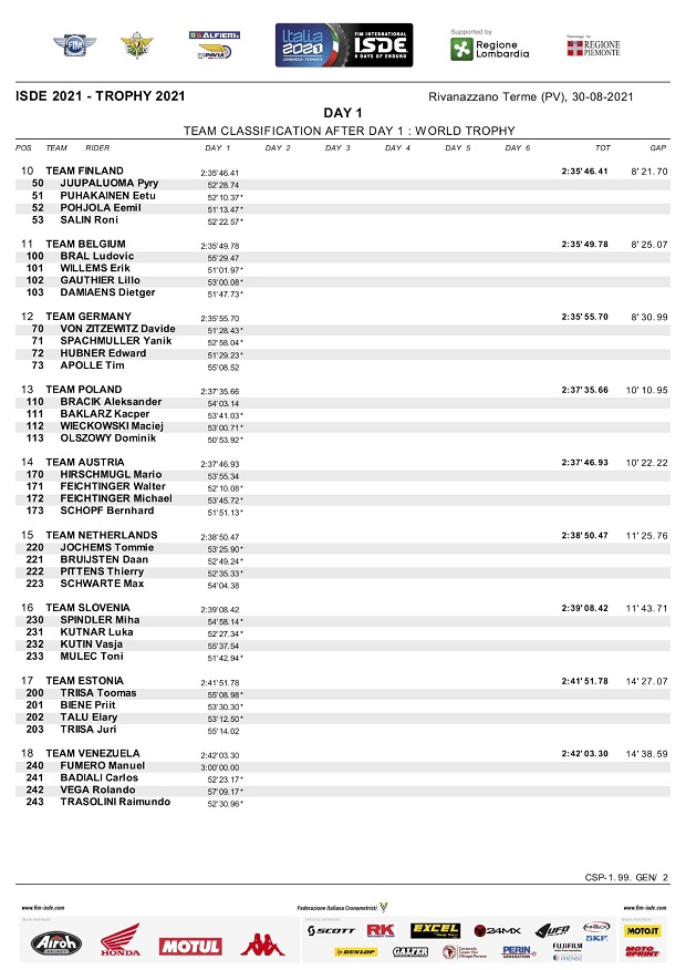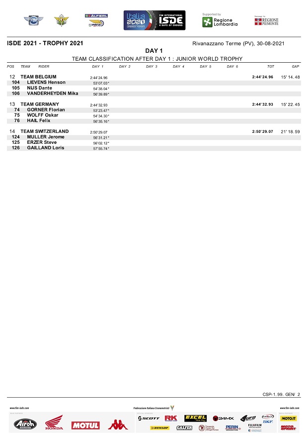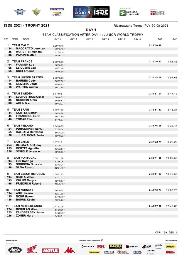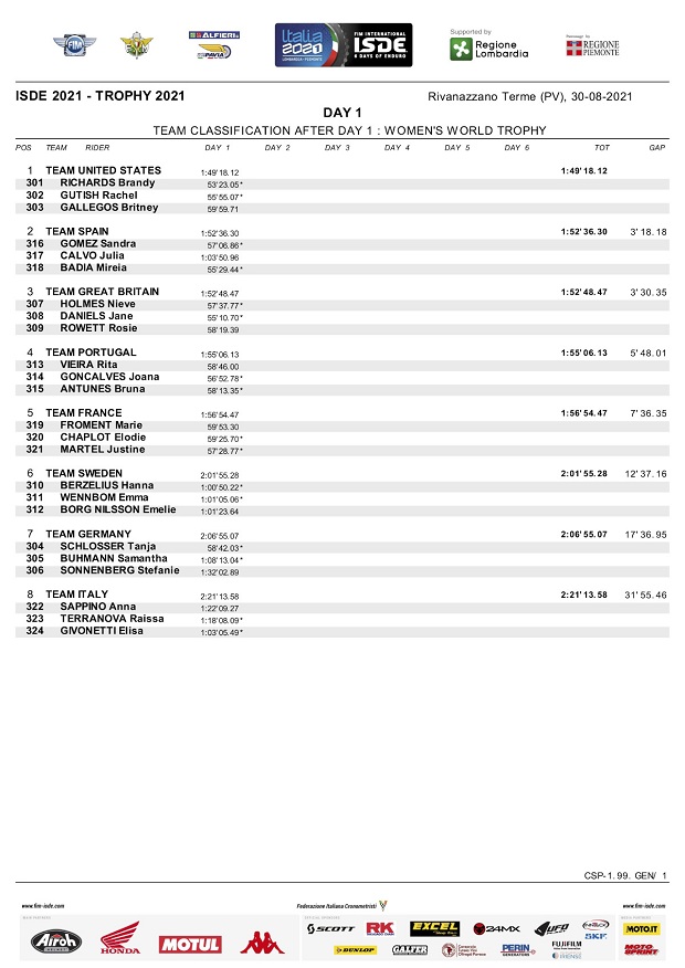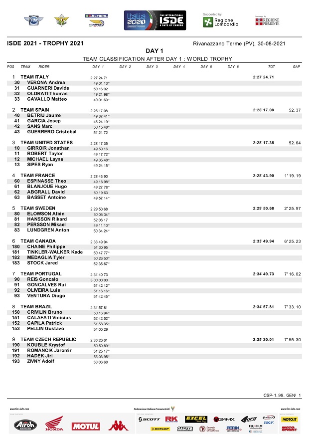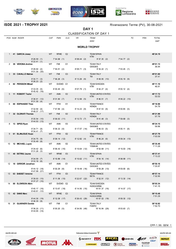 Con clima caluroso, seco y una temperatura que rondó los 35 grados al mediodía, comenzaron los ISDE Italia 2021 en Rivanazzano Terme, donde el español Josep García (KTM Factory) dejó clara su intención de ir por la scratch individual, empujando a su equipo a la segunda posición entre las selecciones Trophy, lideradas por el equipo local italiano que metió 5 de sus pilotos entre los 10 mejores, punteando también con su equipo Junior Trophy. Entre las mujeres, Estados Unidos liderada por Brandy Richards, tomó la punta, mientras se espera la reacción de los campeones actuales, que por ahora marchan terceros.
