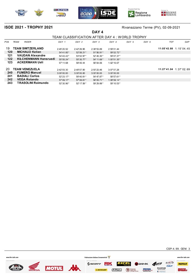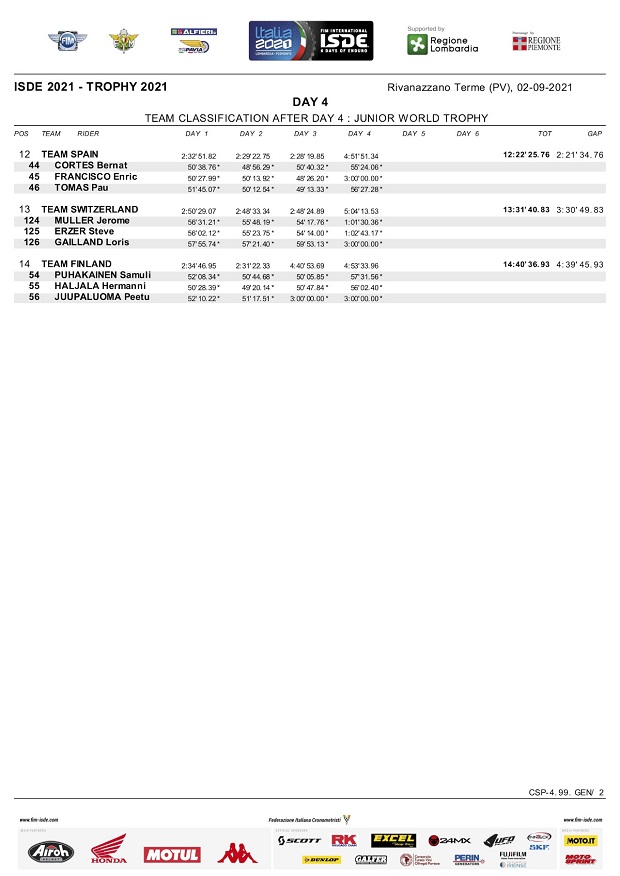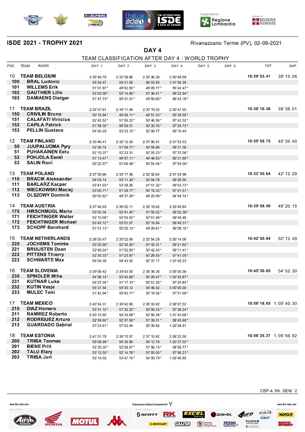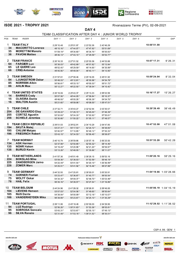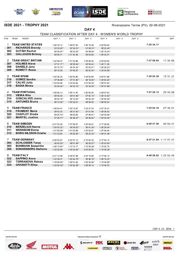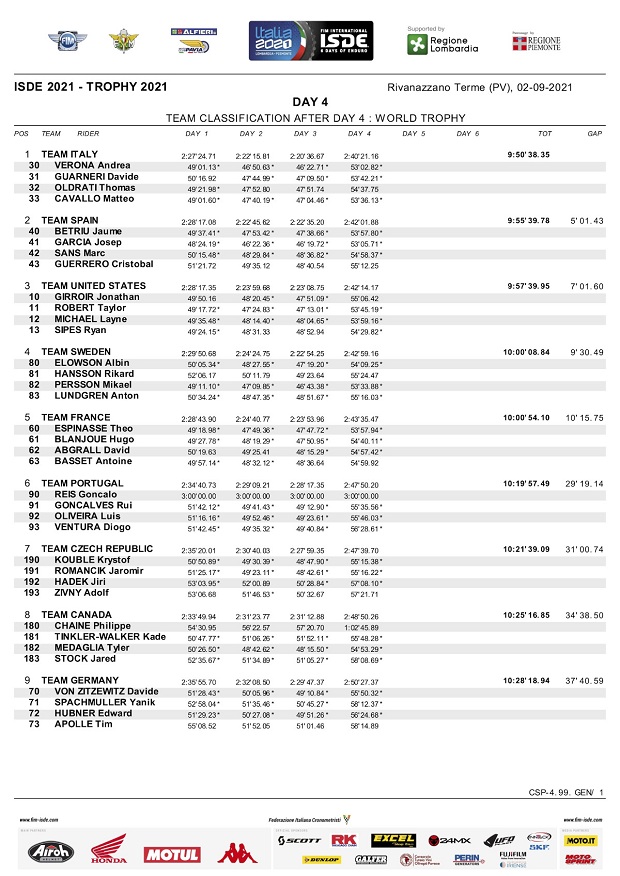 El cuarto día de los ISDE Italia 2021, trajó la novedad de que Andrea Verona (GasGas) ganó su primer scratch individual, aunque el español Josep García (KTM Factory), sigue manteniendo la punta en este punto. Italia mantiene el liderazgo en Trophy 5 minutos por delante del equipo España y 7 minutos por delante de los EE.UU. También en Junior, Italia sigue líder por delante de Francia, ya que la USA perdió terreno ante un fuerte golpe de Austin Walton que podría ser abandono del piloto para mañana y adiós para el equipo americano, mientras que Enric Francisco (Sherco) abandono por rotura y con ello España cayó al puesto 12º. En mujeres, sigue firme EE.UU camino al título, mientras que Brasil sigue como mejor sudamericano en la posición 11º en Trophy y Chile la mejor selección en Junior en el 5º puesto.
