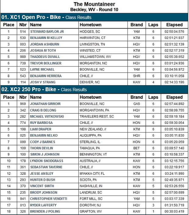El GNCC americano disputó su 10º round con el GP The Mountaineer en West Virginia, con la sexta victoria para Steward Baylor (Yamaha) en la clase XC1 y la séptima del joven revelación Jonathan Girroir (GasGas) en XC2. Sin embargo, Baylor aún lucha por tomar el liderazgo de la categoría en manos de Ben Kelley (KTM), tras un arranque ausente del piloto de Carolina, que ahora está a 4 puntos. Los chilenos Ruy Barbosa (Honda) y Benjamín Herrera (Sherco), fueron 4º y 8º en XC2 y XC1 respectivamente, donde el piloto de 250cc. ya marcha quinto en el campeonato de su divisional.