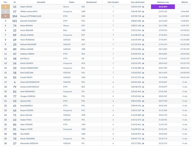 La Hero Challenge en Polonia, sexta prueba del Mundial FIM de Hard Enduro, fue ganada por el sudafricano Wade Young (Sherco), tras un acierto del equipo francés de realizar dos en vez de tres paradas de recarga de combustible, tras batallar con Billy Bolt (Husqvarna) que con su segundo puesto es ahora líder del torneo, con un punto de ventaja sobre el tercero aquí, Manny Lettenbichler (KTM). A falta de dos carreras por disputar, el certamen se pone al rojo vivo, tras esta fecha en Polonia donde también se destacaron Alfredo Gómez (Husqvarna) ganador del Súper Enduro y el piloto revelación local Dominik Olszowy (KTM), ganador del prólogo.