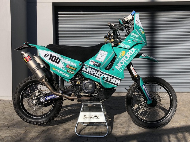 En esta preparación de confinamiento ha primado la sencillez y la fiabilidad. El punto de partida es una Ktm Lc4 625 SXC, con barras y amortiguador WP de 300 mm de recorrido preparados por TP-Off Road, que junto con su chasis, lanzamiento de la horquilla y distancia entre ejes, proporcionan al conjunto una gran estabilidad a altas velocidades.