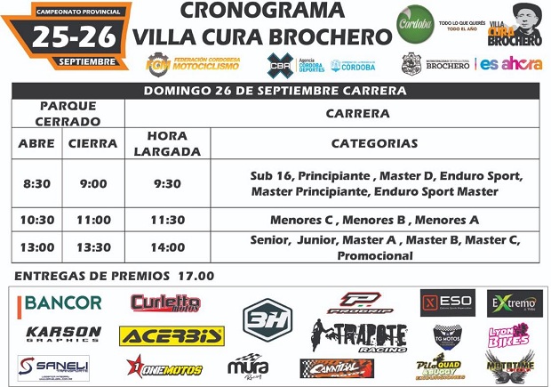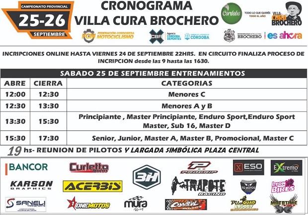 El Campeonato Provincial de Córdoba de Enduro 2021, tiene todo lsto para su sexta parada en la ciudad de Villa Cura Brochero, llegando por primera vez en el año al valle de traslasierra, ingresando en lo que serán las tres últimas citas del año. Para esta ocasión, el sanjuanino medallista Six Days Juan Cruz Martínez, realizará una clínica gratuita para 15 pilotos inscriptos del torneo, para posteriormente pasar a las clásicas prácticas libres del día Sábado por la tarde, se sumará a las 19 horas la reunión de pilotos y posterior largada simbólica, en la Plaza Central Centenario, donde habrá sorteos y shows posteriores a que los pilotos bajen de la rampa. El certamen llega con posiciones muy ajustadas en varias de sus categorías, por lo que la lucha por ingresar al podio anual o pelear por el título, serán sin dudas intensas.