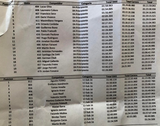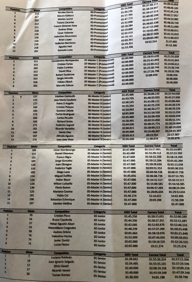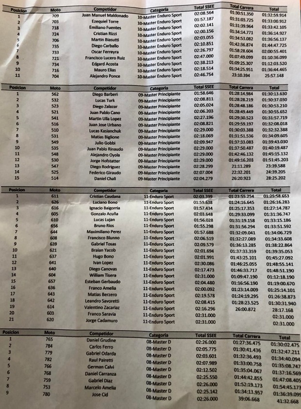 En Junior, el riotercerense Cristián Picco (Yamaha-BMmotoparts-HLShocks) metió su segundo triunfo anual sobre tres participaciones, con Bruno Capdevila (KTM) muy cerquita y en modo campeonato, ya que lidera el mismo con comodidad. En Master A, César Giordanengo (KTM) volvió al triunfo, con abandono de Pablo Cid (KTM) con problemas en su moto, pero el campeonato casi bajo el brazo. En Master B, Esteban Gastaudo (Husqvarna-Mura Racing) ganó y ya puede gritar campeón anticipadamente, triunfando nuevamente con gran margen sobre el resto. En Master C, Constantino Bertopaulos (Husqvarna-HLShocks) logró su segundo triunfo, postergando festejos en la clase, sobre todo ante el abandono de Marcelo Zalazar (Beta), que sufrió una fuerte caída y abandono, sin consecuencias mayores para él por suerte. Cerrando la final, en Promocional, Nicolás García (Yamaha-HLShocks) logró su segundo triunfo y se sube como escolta en el torneo.
