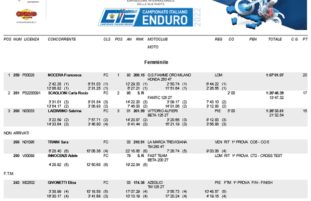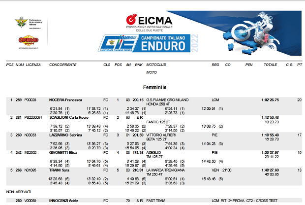 El Campeonato Italiano de Enduro inició en Arma Di Taggia este fin de semana, donde el italiano Andrea Verona (Gas Gas) y el neozelandés Hamish MacDonald (Sherco) repartieron victorias, en el día 1 y 2 respectivamente, siendo escoltas uno del otro en cada día. La riojana Carla Scaglioni (Fantic JET Zanardo) tuvo un muy buen debut, ocupando la segunda posición en Damas de la Copa Italia en ambas jornadas, detrás de la experimentada Francesca Nocera (Honda) que viene del motocross. Ilustres apellidos como el de Rupretch, Watson, Salvini, Espinasse, Oldrati y Milner entre otros, dieron vida a la apertura del Assoluti, cerca de la frontera con Francia.