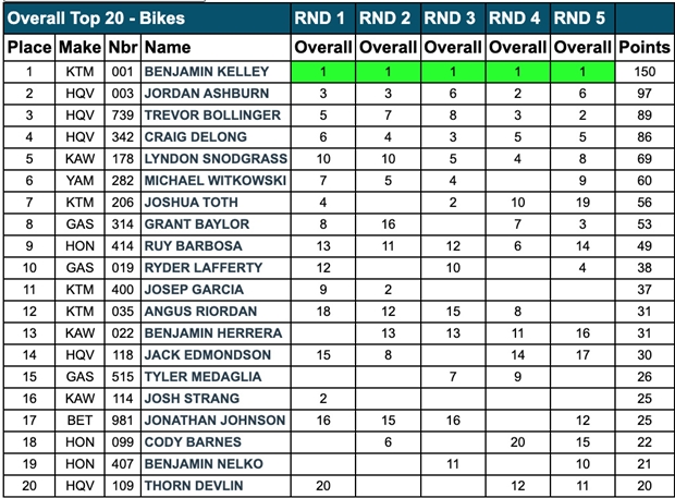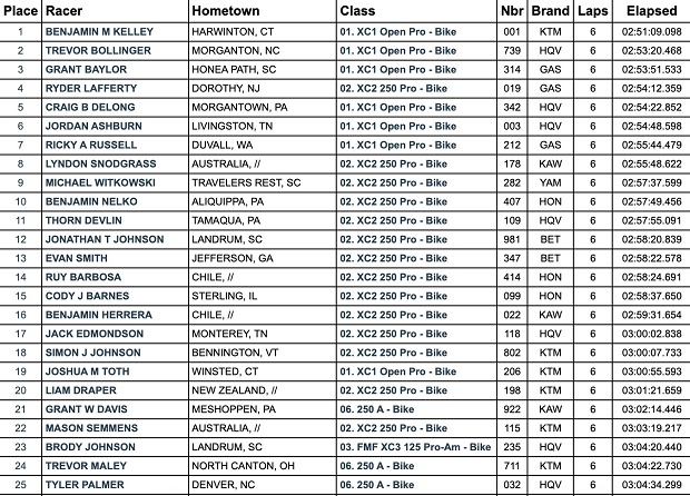 El GNCC americano se presentó para su quinto round en Moree’s Sportsman’s Preserce en Society Hill, Carolina del Sur, donde Ben Kelley (KTM Factory) obtuvo su quinta victoria consecutiva, tras un efímero buen inicio de Ricky Russell (GasGas), tomando la punta en la largada. Ryder Lafferty (GasGas), se quedó con su primer victoria en la XC2, reservada para máquinas 250cc., donde los pilotos chilenos Ruy Barbosa (Honda) y Benjamín Herrera (Kawasaki), fueron 8º y 10º respectivamente. Una nota saliente fue el regreso del múltiple campeón Kailub Russell, aunque lo hizo en categoría menor sportman.