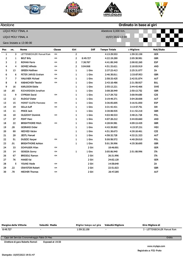 El piloto alemán Manuel Lettenbichler (KTM Factory) logró su tercer triunfo consecutivo en el Mundial FIM Hard Enduro, al quedarse con la Red Bull Abestone delebrada en la Toscana italiana. A pesar de un mejor arranque del aún líder del mundial Billy Bolt (Husqvarna Factory), que se quedó con el uno en la clasificatoria, Manny fue contundente en la carrera en sí logrando un nuevo triunfo y colocándose a solo dos puntos de Billy en el ranking mundialista.