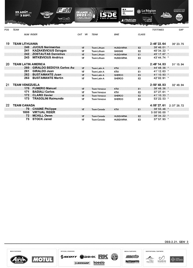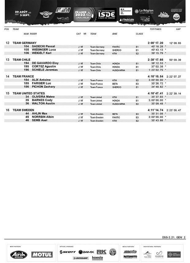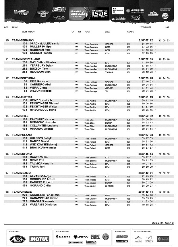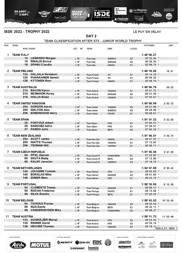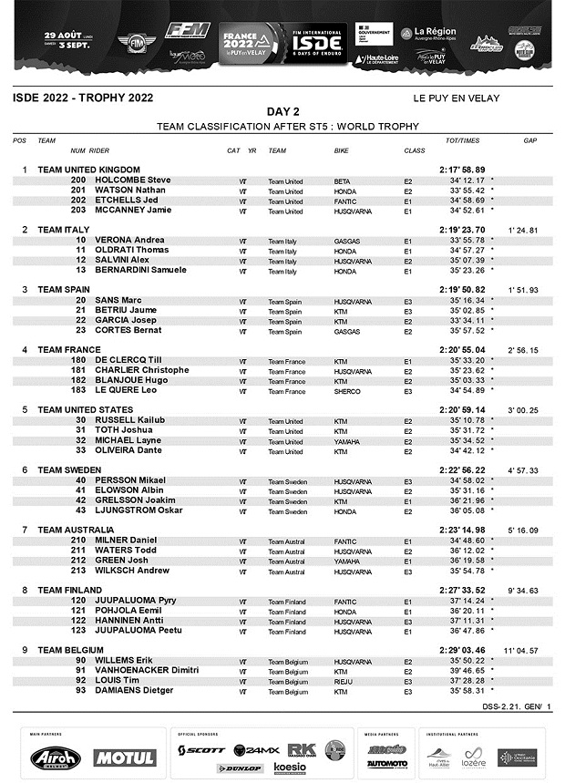 Gran Bretaña ha tomado la punta de los Six Days tras su segundo día de competencia, con una actuación sobresaliente de sus 4 pilotos Nathan Watson (2º), Steve Holcombe (4º), Jamie McCanney (8º) y Jed Etchells (12º), desplazando a España al tercer lugar, a pesar de que Josep García (1º) nuevamente se impuso en el individual, ganando 4 de 5 especiales, donde el americano Dante Oliveira (5º) fue el único hasta aquí en batir al español en un cronometrado. Segundo entre las selecciones mayores, ahora se ubica el campeón Italia. En Junior, no hubo cambios ganando el equipo italiano, al igual que en Damas donde EE.UU estiró aún más la ventaja en la general. El clima ha sido menos agobiante en el día de hoy, con lluvias fuertes sobre el final de la jornada, con los pilotos club en pista. Carla Scaglioni (Husqvarna) y Dario Ferrandíz (Husqvarna) continúan en carrera, en el puesto 109º tras un retraso de la chilena Valeria Rodríguez ayer, quién completa el equipo junto a los argentinos.