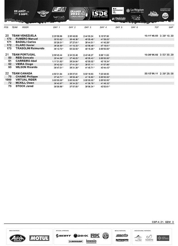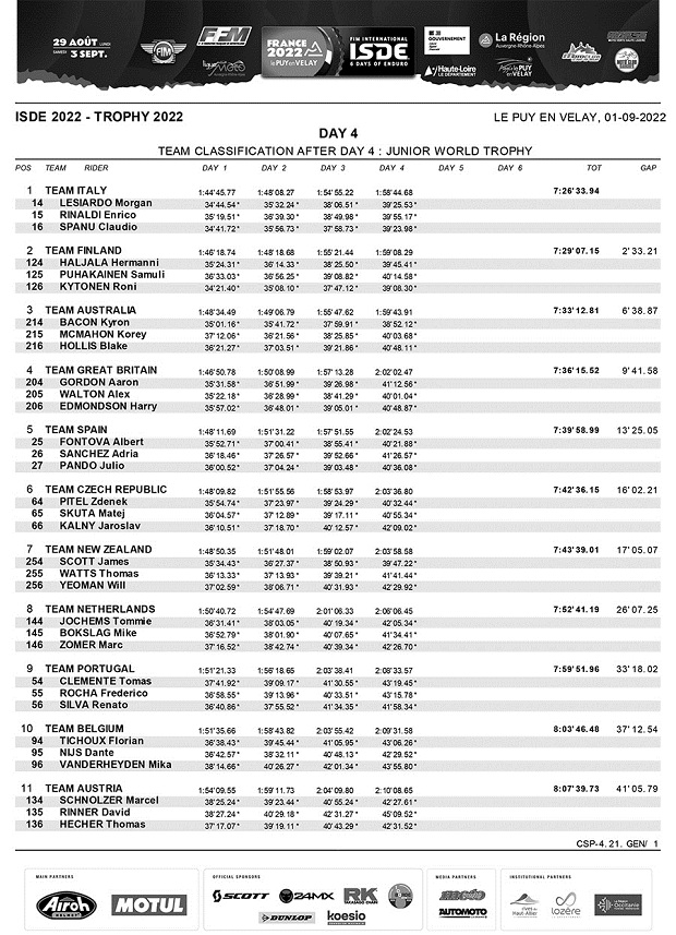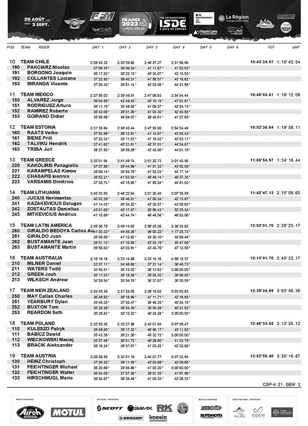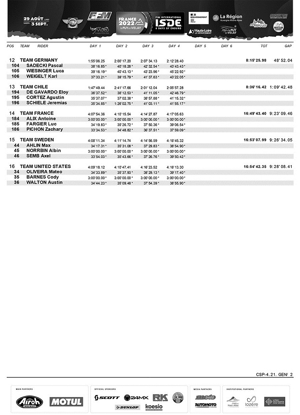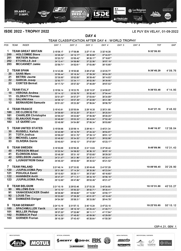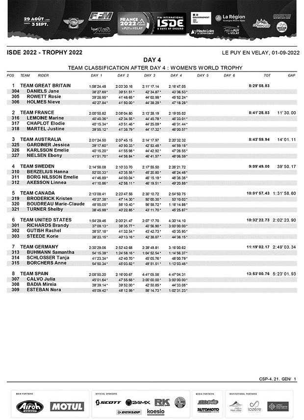 En el cuarto día de los ISDE Francia 2022, la noticia saliente ha sido el abandono de Brandy Richards (USA), la señorita que venía dominando los Seis Días y empujando a un nuevo triunfo a su país, tras una caída debió abandonar, dejando el liderazgo en Damas a Gran Bretaña, que acaricia un histórico doble triunfo, ya que en mayores, hoy sostuvo la punta gracias a una nueva buena actuación de sus cuatro pilotos Trophy. El español Josep García (1º), volvió a ganar el individual, empujando junto a Jaume Betriu (8º) a España a recuperar el segundo puesto, con solo 4 segundos de ventaja sobre Italia, lo que promete una batalla sin cuartel para mañana, con pronóstico de lluvia y nueva traza. En Junior, todo sigue igual con Italia en lo más alto y solo Finlandia como rival de peligro. Los argentinos Carla Scaglioni (Husqvarna) y Darío Ferrandiz (Husqvarna) siguen luchando en clase Club dentro del top 100. Chile sigue como mejor equipo latino en mayores en posición 10º.