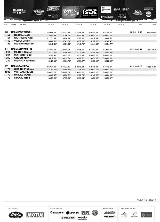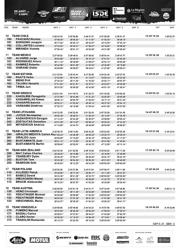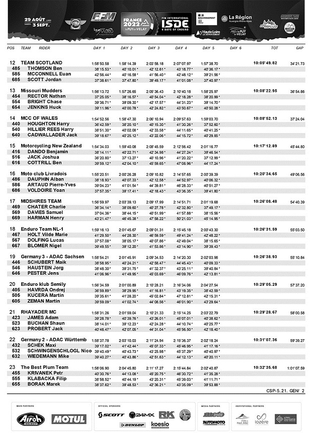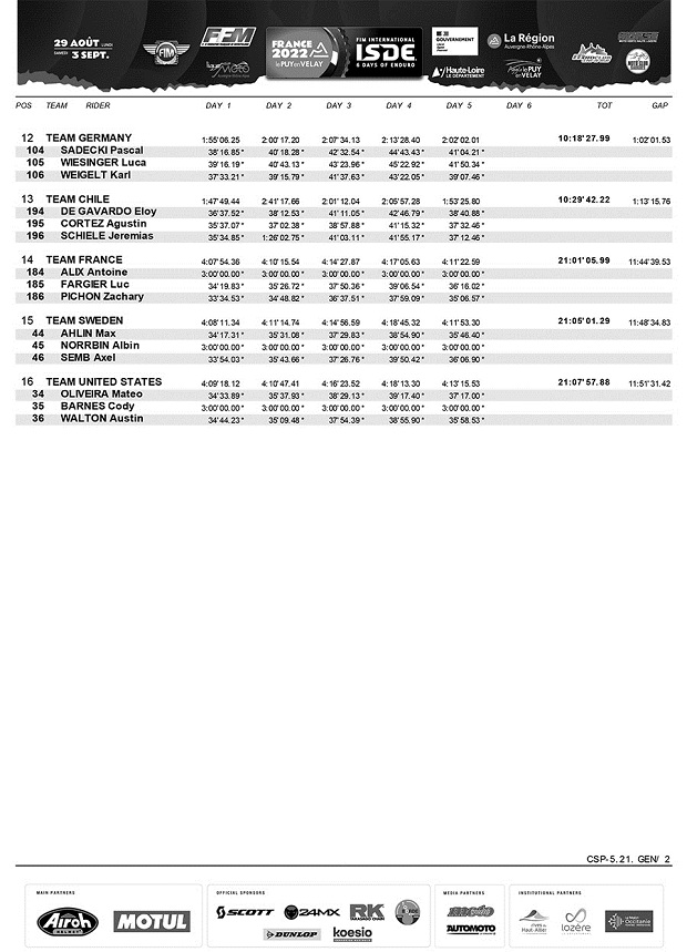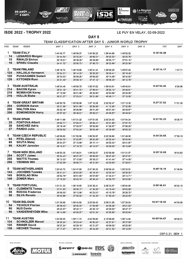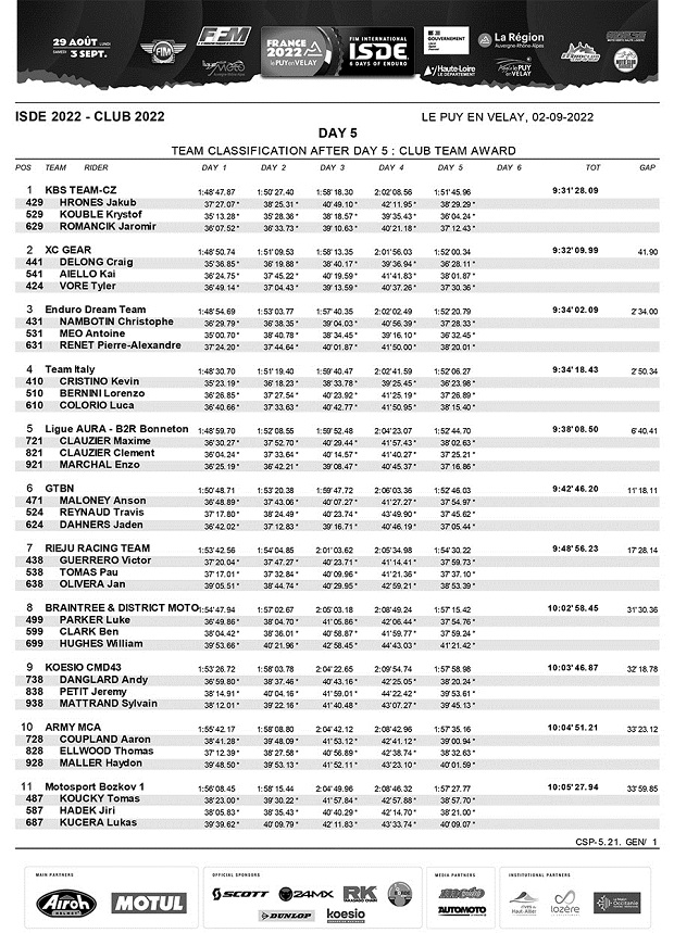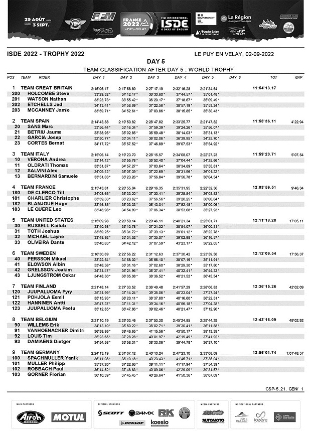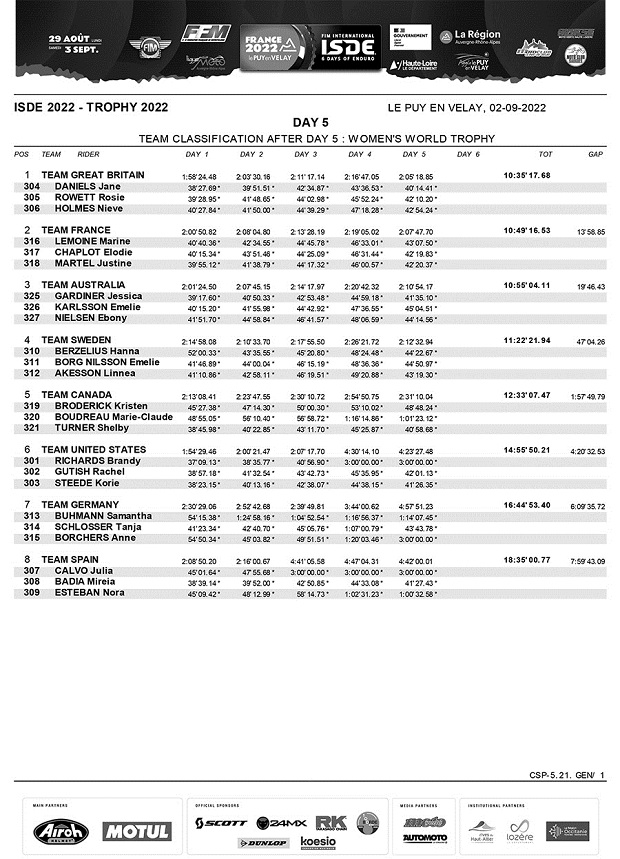 Gran Bretaña quedó a un paso de concretar su primer victoria en un Seis Días de la era moderna, al finalizar la quinta y ante última jornada en los ISDE Francia 2022, donde los ingleses lograron ampliar aún más su ventaja en la clase Trofeo y Damas. La lucha individual volvió a ser apasionante entre el italiano Andrea Verona (1º) y el español Josep García (2º), con triunfo para el itálico por tan solo 0.04 centésimas, aunque el español sigue dominando en la general del ISDE. En Junior, los italianos caminan con confianza hacia el triunfo, aunque Finlandia logró descontar unos 20 segundos, restando solo el motocross final del sexto día. Chile sigue ubicado como mejor selección sudamerica en Trofeo (10º) y la única participante sudamericana en Júnior. La riojana Carla Scaglioni (216º) y el sanjuanino Darío Ferrandiz (267º) a un paso de concluir los Six Days, ubicados con su equipo club en la posición 94º del clasificador, siendos los únicos pilotos argentinos participantes del evento.