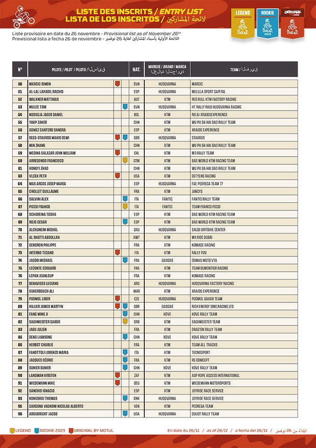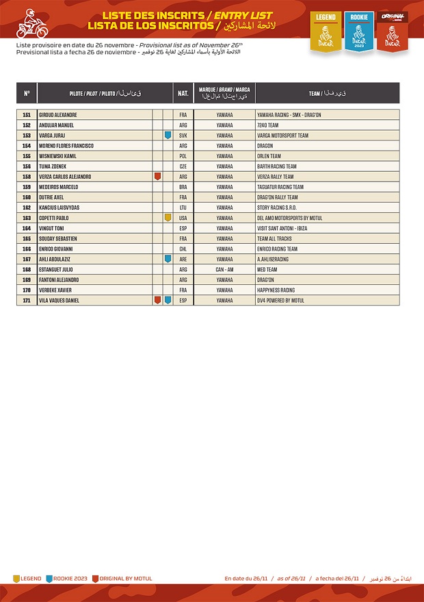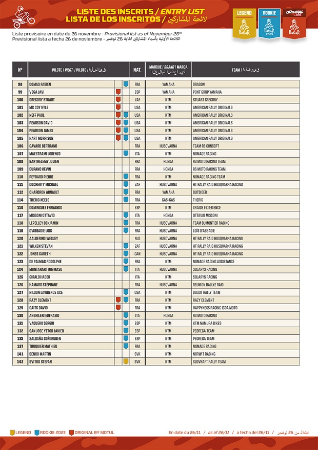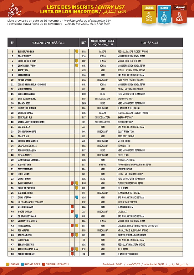 Confirmado está ya el listado completo de pilotos de moto y quads que iniciarán el Rally Dakar 2023 en Arabia, con sus respectivos números identificatorios y sus distintas categorías, Rally GP, Rally 2, Malle Motul (ex original sin asistencia externa) y Quads. Los argentinos serán, Kevin Benavides (RedBull KTM Racing), Luciano Benavides (Husqvarna Racing), Franco Caimi (Hero Racing), Diego Llanos (Rieju Racing) y Stéfano Caimi (BAS KTM) en moto, Manuel Andújar (Yamaha 7240 Team), Francisco Moreno (Yamaha Dragon), Carlos Verza (Yamaha), Julio Estanguet (Can-Am MED), Alejandro Fantoni (Yamaha Dragon) y Pablo Copetti (Yamaha) que si bien es argentino, correrá representando a la USA en Quads.