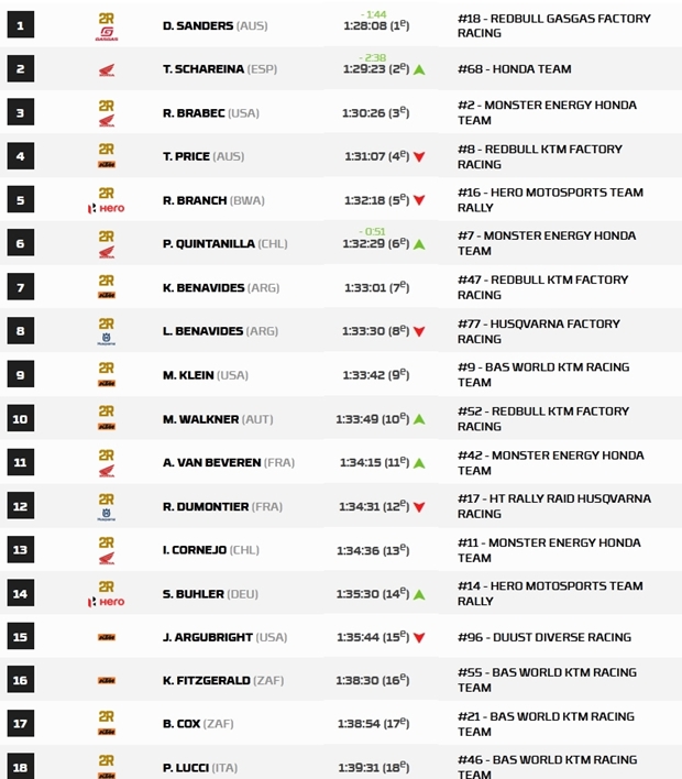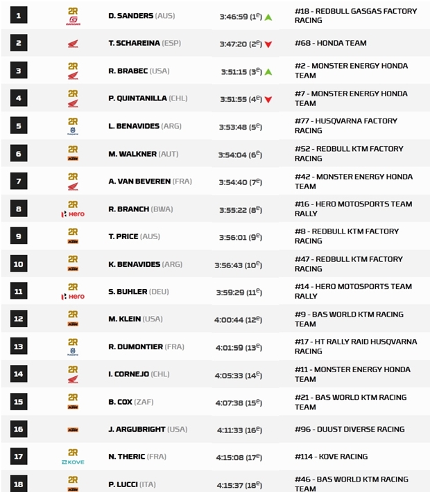 Daniel Sanders (Gas Gas) ganó la especial 2 con 1’15” de ventaja sobre Tosha Schareina (Honda). El piloto de GasGas debería tomar el liderato de la clasificación general con 21 segundos de ventaja sobre Tosha Schareina cuando llegue al vivac de Puerto Peñasco. Daniel Sanders ganó la especial 2 con 1’15” de ventaja sobre Tosha Schareina. El piloto de GasGas debería tomar el liderato de la clasificación general con 21 segundos de ventaja sobre Tosha Schareina cuando llegue al vivac de Puerto Peñasco. Hoy Kevin Benavides pudó subir algo más para ser 7º en la etapa y entrar en el top ten de la general en la décima posición, mientras Luciano Benavides (Husqvarna), marcha quinto en el rally, tras ser octavo en el día de hoy, que sufrió demoras en el inicio, e incluyó las deserciones de Sam Sunderland (Gas Gas) y el último ganador del Sonora Rally, Skyler Howes (Husqvarna), ambos con caídas al inicio de la especial.