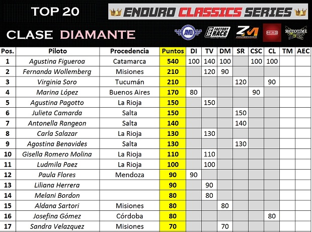 Con lo cómputos oficiales ya instalados, del sexto evento puntable de la Copa AMD Enduro Classics Series, llevado a cabo con la La Carrera del Lago en Escaba, la catamarqueña Agustina Figueroa (Husqvarna MIAG Racing), ya consiguió los puntos necesarios, para consagrarse virtualmente nueva Reina de Clásicos del enduro argentino, ya que con su sola presencia en el Aconcagua Enduro Challenge, a celebrarse en Las Leñas, cumplirá con la exigencia del reglamento para validar sus puntos anuales, convirtiéndose así, en la tercer señorita en lograr el título ECS Diamante, tras los logrados por Carla Scaglioni (2019) y Carolina Yapur (2022).