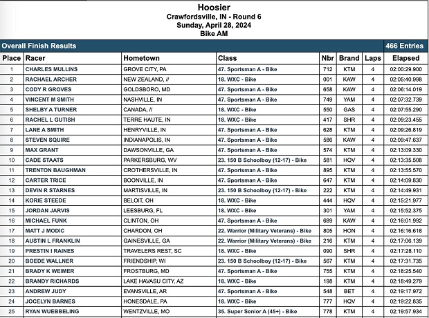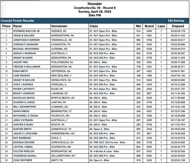 El fin de semana pasado, se disputó la sexta ronda del GNCC con el gran premio Hoosier, en Crawfordsville, Indiana, donde Steward Baylor (Kawasaki), selló su segunda victoria consecutiva, tras acertar con su estrategia de pit stop. En la clase mayor XC1 Pro, Craig DeLong (Husqvarna) fue segundo y Jonathan Girroir (KTM) tercero. El salteño Nicolás Kútulas (KTM), se ubicó 12º en la clase 250 A, tras un neto de 3 horas 2 minutos 38 segundos, con un giro menos que el ganador en la categoría, Jason Tino (Husqvarna), que fue 8º a la vez en la general. En XC2 250 Pro, ganó el australiano Angus Riordan (KTM), mientras que entre las damas, la neozelandesa Rachel Archer (Kawasaki), sigue mostrando su dominio.