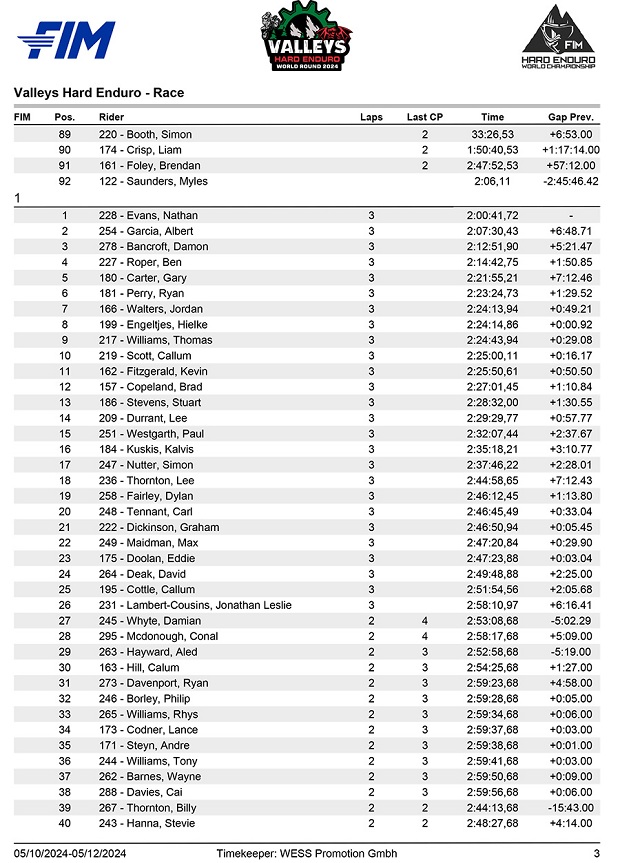 Comenzó el Campeonato mundial de Hard Enduro, con la disputa de la Valleys Hard Enduro en Gales, donde el piloto alemán y campeón del mundo Manuel Lettenbichler (Red Bull KTM), se impuso sin sobresaltos y de principio a fin, tal cuál había concluído su temporada anterior. El nuevo piloto Sherco búlgaro Teodor Kabakchiev y su compañero de equipo Mario Román (Sherco), fueron sus escoltas, tras batallar con los británicos Jonny Walker (Beta) y Will Hoare (Rieju), que firmaron cuarto y quinto respectivamente. Condiciones polvorientas de carrra, aceleraron su desarrollo, al no concretarse la amenaza de lluvias, tan presentes en ese lugar durante gran parte del año, para los casi 200 pilotos presentes.
