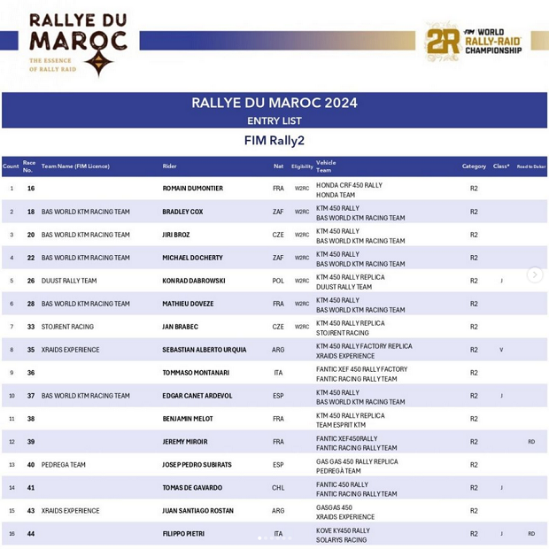 El Rally de Marruecos, a disputarse del 4 al 11 de Octubre próximos, cerrando el calendario del mundial FIM de rally raid, tendrá una fuerte y variada presencia argentina, arrancando por el campeón defensor Luciano Benavides (KTM), que debutará como nuevo piloto KTM, regresando a la marca que le diera el título mundial junior y en el mismo sitio que se consagrara campeón del mundo en 2023. Otra de las sorpresas, llegará de la mano de la riojana Carla Scaglioni (Fantic), debutando la ex campeona argentina de enduro, en una cita mundialista de la especialidad, esta vez bajo licencia italiana, donde reside hace ya varias temporadas. Jeremías Pascual (Husqvarna Pedrega), Leonardo Cola (KTM), Sebastián Urquía (KTM XRaids), Gustavo Milutin (Husqvarna HT) y Santiago Rostán (GasGas XRaids) irán en R2, pensando en regresar al Dakar, al igual que Eduardo Alan, que tras su regreso en el Ruta 40 tras 11 años, volverá al Dakar 2025. Fuera de las motos y tras la eliminación de los Quads, se destaca a Manuel Andújar junto a Bernardo Graue y Pablo Copetti junto a Santiago Hansen, pasando a los UTV, donde el cordobés Nicolás Cavigliasso junto a Valeria Pertegarini, pelean por el título.