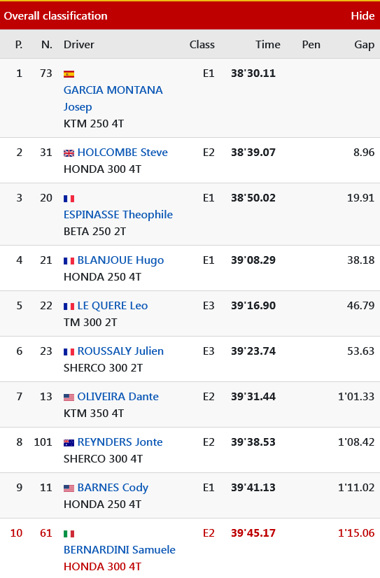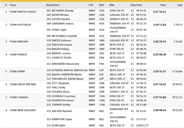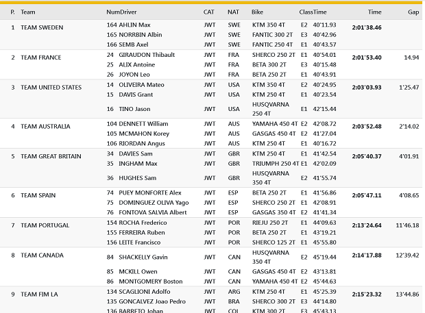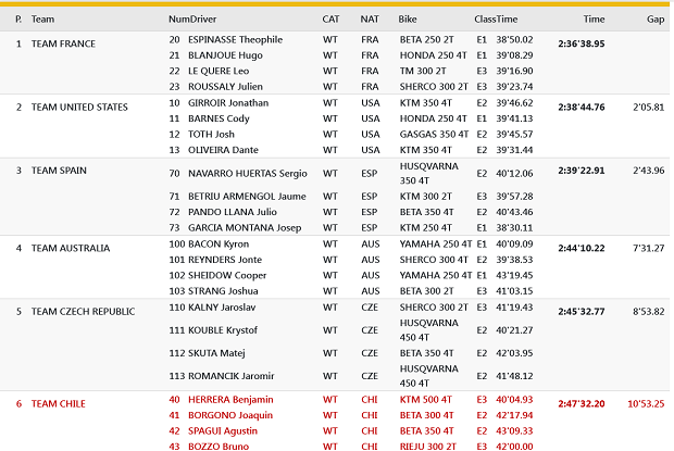 Sin selecciones argentinas en el evento, en la mayor lidera Francia, con un sólido inicio, con los campeones defensores de la USA a más de 2 minutos por detrás y España tercero de la mano de García. Chile marcha sexto, como la mejor selección latinoamericana clasificada de la mano de Benjamín Herrera (KTM). En Junior, Suecia quiere tomarse revancha de la debacle sucedida en San Juan, cuando perdieron el triunfo en el motocross final, lideran en el inicio, pero seguidos de cerca por Francia, quiénes heredaron ese memorable desastre. En Damas, los Estados Unidos comenzaron bien la defensa de su título, pero Australia las persigue de cerca. Cerrando con los argentinos, Scaglioni con el team Junior FIM La marchan novenos, junto al brasileño Joao Goncalvez y el colombiano Johan Barreto. Saavedra marcha 45º con el club Chile 2, mientras que los únicos equipos íntegramente argentinos, son el Club Sicer en posición 70º y el San Juan Racing 104º de 124 equipos club participantes.