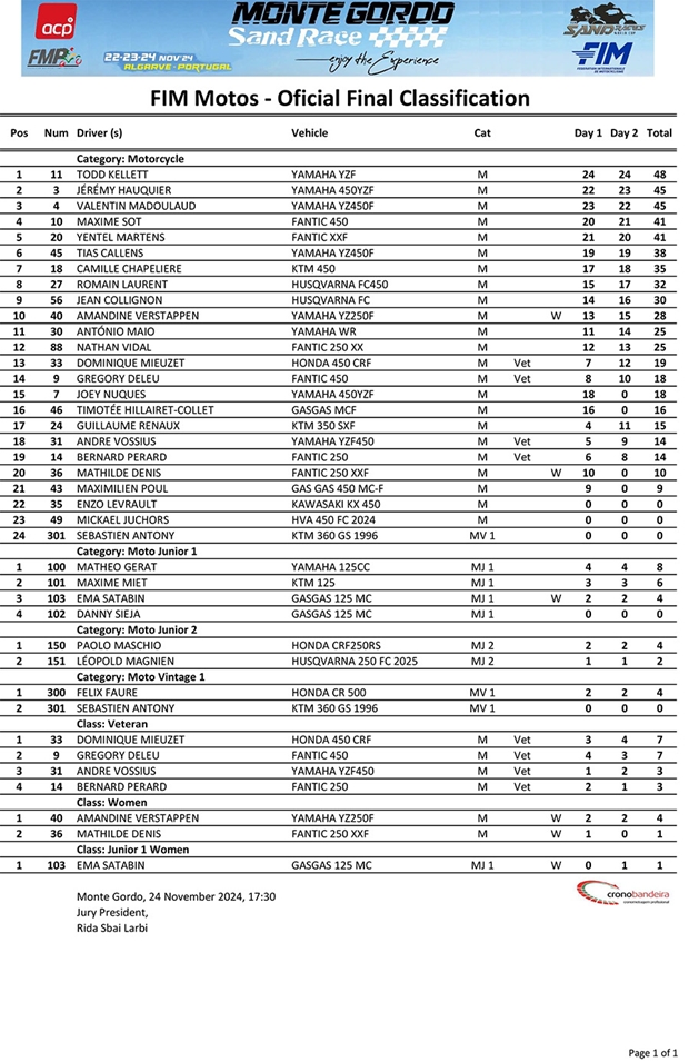 El piloto británico Todd Kellett (Yamaha Drag’on) se coronó campeón por segundo año consecutivo de la Copa del Mundo FIM de Arena, al lograr la victoria en el segundo día de la Sand Race de Monte Gordo en Portugal. El piloto que ganó el Enduro del Verano en Febrero pasado y fuera segundo en el último Enduro del Invierno en Mar del Plata, logra así revalidar su corona conseguida en 2023. “Es increíble cerrar el campeonato hoy”, comentó Kellett. “Con una temporada tan larga, comenzando en febrero, lograr este triunfo es fantástico, sobre todo repitiendo éxito aquí en Portugal.”
