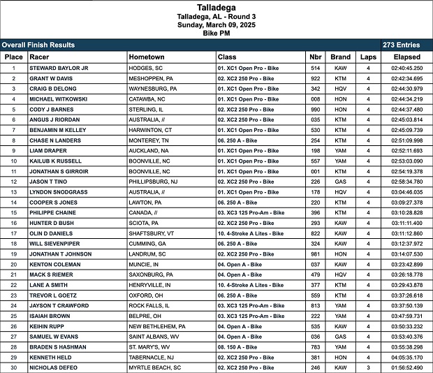 Bajo condiciones climáticas sumamente complicadas, el Grand National Cross Country (GNCC), disputó su tercer round en Talladega, Alabama, que debutaba en el cronograma del torneo mas importante de enduro de la USA, ya sin la presencia del argentino José María Mercado (KTM Argentina), que emprendió regreso a nuestro país tras la segunda ronda, para prepararse en lo que será el debut en el ECS, con el Desafío del Indio en San Luis. Steward Baylor (Kawasaki), sacó a relucir toda su experiencia y resistencia, para superar una carrera disputada entre lluvias y tormenta, que tuvo condiciones de carrera extremas, junto a cambiantes alternativas en la punta, terminando secundado por Grant Davis (KTM), que como piloto XC2 largo detrás y pudo aún con cilindrada mas pequeña, dominar buena parte de la competencia, mientras Craig Delong (Husqvarna), pudo meterse en el podio final y como escolta de la máxima categoría.