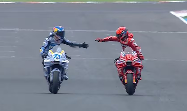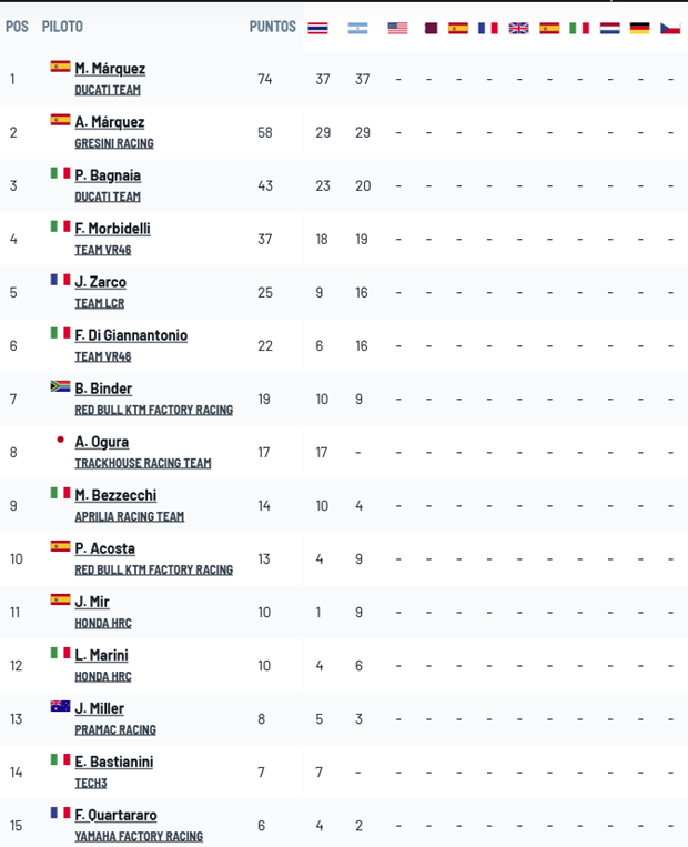 Con un emocionante duelo de hermanos en el circuito de Termas de Río Hondo, se definió la carrera de este domingo en el MotoGP en Santiago del Estero, con una lucha a toda velocidad entre los Márquez, pelea que consagró como campeón del Gran Premio YPF del Mundial a Marc Márquez (Ducati), por sobre Alex Márquez . En su regreso a la Argentina después de seis años de ausencia, se trata de la segunda victoria consecutiva para Ducati y alcanza el puntaje ideal en el campeonato. Franco Morbidelli (VR46 Racing) se quedó con el tercer lugar y así suma siete podios. Cuando parecía que Alex, con su Gresini, tenía bajo control la carrera por la segunda fecha del Mundial de Motociclismo, Marc hizo lo suyo y a cinco vueltas del final metió su moto Ducati en un recoveco para superar así a su hermano menor. Previamente, en la carrera de Moto2, el británico Jake Dixon (Elf Marc VDS Racing Team) no tuvo rival, mientras que en Moto 3, Ángel Piqueras (Frinsa-MT Helmets-MSI) se destacó con una victoria trabajada.