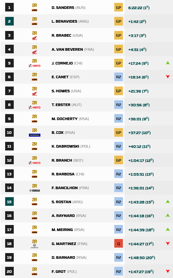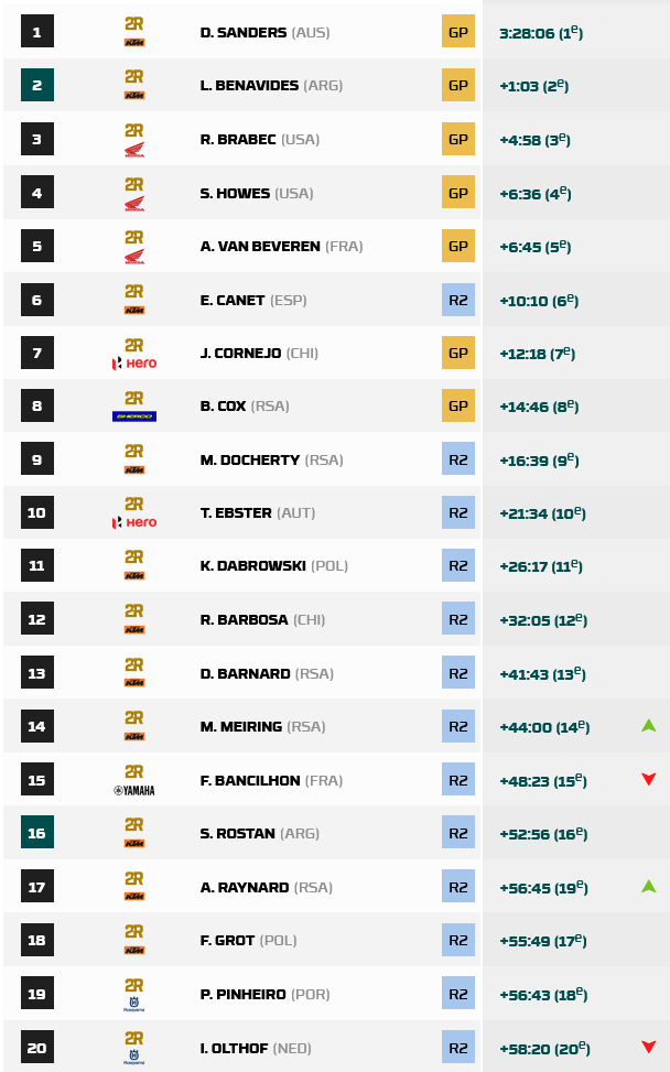 La etapa 2 del Safari Rally en Sudáfrica, transito desde el epicentro en Sun City, hacia el Marathon Camp, cerca de la ciudad de Stella, con la etapa mas extensa de la carrera con un total de 623 kms. y 356 Kms. de especial. Los pilotos no contarán con asistencias esta noche, solo autorizados a trabajar en la moto 30 minutos los RallyGP y 1 hora los Rally2, que solo pueden ser ayudados por otros pilotos. El día de hoy se produjo el abandono de Tosha Schareina (Honda), quién no largo tras un golpe recibido ayer en carrera, aunque termino la etapa. El australiano Daniel Sanders (KTM), volvió a ganar otra etapa, esta vez acompañado en gran rendimiento por su compañero de equipo Luciano Benavides (KTM), que apretó fuerte en la segunda parte del stage, quedando a solo 32 segundos de Chucky, pasando a liderar ambos la general con una diferencia de 1’11” en favor del australiano. El ganador de ayer Ross Branch (Hero), perdió mas de una hora parando en dos ocasiones a reparar su moto. Las Honda oficiales, se retrasaron en la general, siendo en la etapa Ricky Brabec 3º, Skyler Howes 4º y Adrien Van Beveren 5º. También piloto oficial KTM, el joven Edgar Canet (KTM), ganó la etapa y lidera en Rally2, donde el neuquino Santiago Rostan (KTM XRaids) se ubicó 16º en la general y 9º en la clase, el cordobés Sebastián Urquía (KTM XRaids) 27º y 17º respectivamente y el mendocino Gustavo Milutin (Husqvarna HT) al momento de cierre de la nota, se encontraba cerca del final de etapa.