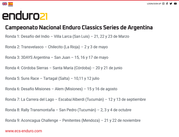 El medio de comunicación británico Enduro21, considerado el mas importante e influyente del enduro mundial, publicó los calendarios de los eventos mas importantes del planeta para el 2026, donde se incluyó el calendario del Enduro Classics Series argentino (Ver Enduro21.com) y el Campeonato Latino de enduro en Brasil, junto a todos los mundiales de las distintas especialidades del enduro, EnduroGP, Hard Enduro FIM, Súper Enduro FIM, ISDE, las grandes pruebas del enduro mundial por fuera de campeonatos, GNCC, Grand National AMA, Assoluti Italiano y los certámenes españoles, australianos, japoneses, franceses y británicos, como así también los grandes eventos del Rally Raid y de bajas. Siempre consultado por pilotos, organizadores, autoridades y público en general amante del enduro y los rallies, Enduro21 concentra las novedades, entrevistas y actualizaciones mas importantes del ambiente, por su presencia en los mayores eventos del planeta (mayormente disputados en Europa), aunque con coberturas fuera del continente, de la mano de Jon Pearson, Nicky Martínez y todo el equipo de Future 7 Media.