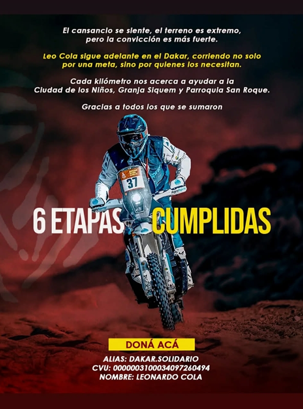 En el Rally Dakar existen mil historias más allá de la competencia propiamente dicha, una de ellas muy especial, es la del cordobés Leonardo Cola (KTM Joyride), que más allá de su desafío personal por vencer al gigante, llevó hasta Arabia Saudita una movida solidaria, donde por cada kilómetro recorrido, más el aporte de gente que quiera sumarse a la cruzada, busca recaudar fondos para ayudar a la Ciudad de los niños, la granja Siquem y la Parroquía San Roque de Río Cuarto, segunda ciudad de la provincia de Córdoba, muy cerca de su Higueras natal. Todos pueden donar una pequeña contribución, mediante una cuenta especialmente abierta en Mercado Pago, ayudando no solo a niños que lo necesitan, sino también a toda una comunidad necesitada y que se encuentra detrás del sueño de Leonardo, que con suerte se concretará al momento de recibir el banderazo final en Arabia y ver, que ello también ayudo a quién lo necesita.