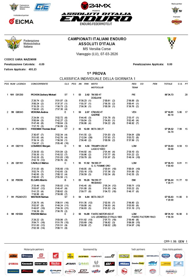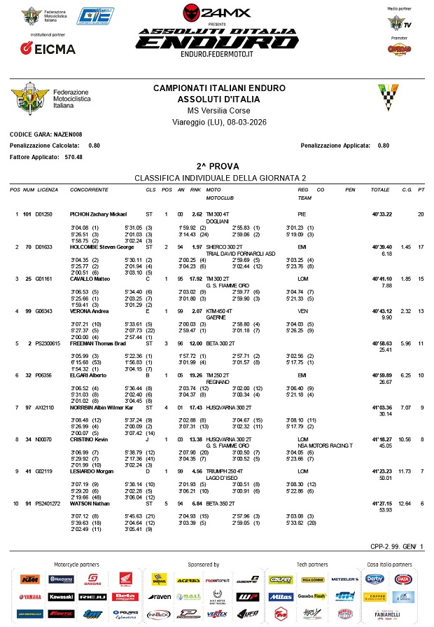 El Campeonato Italiano de Enduro largó como muchos otros su temporada 2026, con varios pilotos mundialistas de EnduroGP presentes, celebrado en Viareggio, en la región de La Toscana italiana, la apertura se celebró a fecha doble y con el dominio inicial del francés Zach Pichon (TM) , convertido en el hombre a batir a partir de aquí con una sólida performance en ambas carreras. Andrea Verona (KTM) y Brad Freeman (Beta) lo escoltaron el primer día, mientras que Steve Holcombe (Sherco) y Matteo Cavallo (TM), lo hicieron en la segunda jornada, postergando mejores intenciones de jinetes como Morgan Lesiardo (Triumph), Nathan Watson (Beta), Albin Norrbin (Husqvarna) o Kevin Cristino (Husqvarna), que quedaron más atrás.