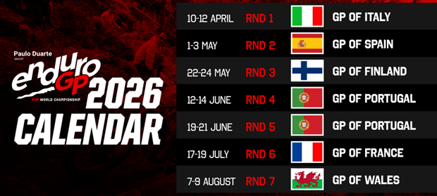 El calendario al menos provisorio del mundial de EnduroGP 2026 fue confirmado, por parte de su promotor Prime Stadium Eventos junto a la FIM, con la novedad de la inclusión final de la fecha francesa, la cuál fuera cancelada este año por inconvenientes económicos, brindando ahora las garantías por la Federación Francesa. Nuevamente y como en los últimos años, el torneo se mantiene dentro de Europa, por cuestiones de presupuesto de equipos y pilotos.
