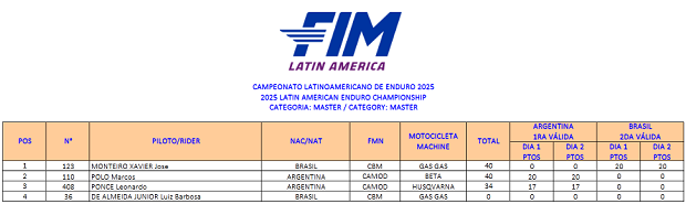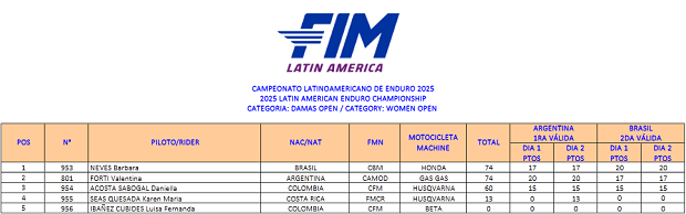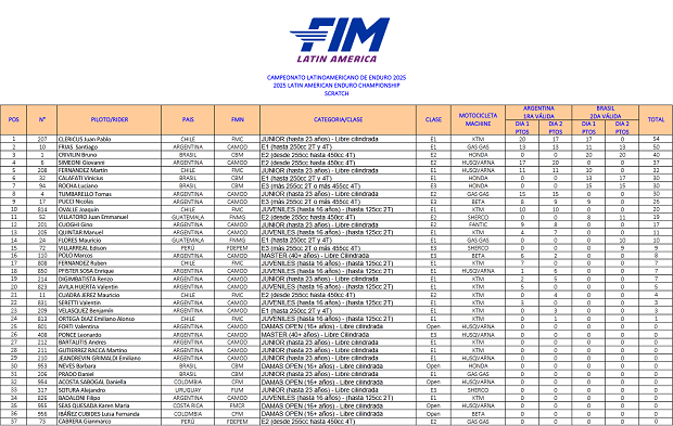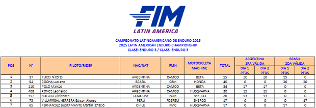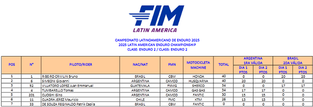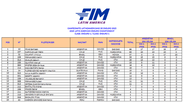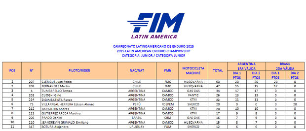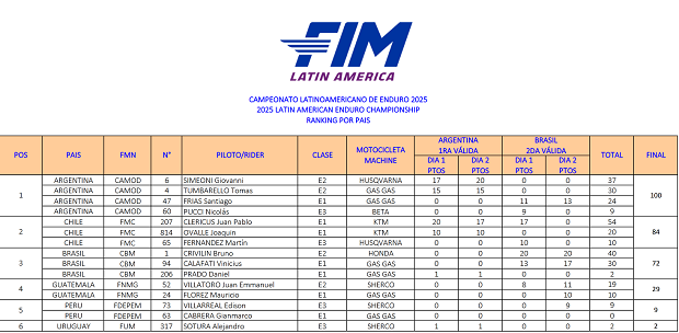 El Campeonato Latino de Enduro que cerró su inusual participación 2025 a dos sedes, consagró sus podios y campeones, sellando ahora sí de manera oficial y publicado, el título por naciones para la Argentina, de la mano de la participación de Santiago Frías (Gas Gas Acedo Racing), Nicolás Pucci (Beta Mendoza), Giovanni Simeoni (Husqvarna Argentina) y Tomás Tumbarello (Gas Gas Argentina) como representantes. Argentina reunió un total de 100 puntos, frente a los logrados por Chile como subcampeón con 84 unidades y por Brasil tercero, con 72 puntos a su favor, siguiendo por detrás Guatemala, Perú y el Uruguay. En lo individual 2 campeones, Frías (E1) y Pucci (E3), tres subcampeones con Simeoni (E2), Marcos Polo (Beta AMD GF) en Master y Valentina Forti (Husqvarna Argentina) en Damas y tres terceros, el mencionado Polo (E3), Tumbarello (Junior) y Leonardo Ponce en Master.