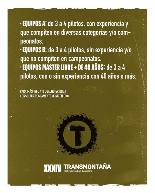 Casi 40 equipos ya inscriptos y de los que sabemos que ya lo tienen armado y todavía no se inscriben, como siempre las clases equipo se reservan una aventura aparte, con 3 o mas integrantes, imposible nombrarlos a todos, pero sorprende encontrar aquí, al subcampeón nacional y del Enduro Classics Series 2024, Luciano Bellone, que armó escuadra junto a Matías Estofan, Bernabe Teran Lobo y Francisco Gallardo, aprovechando este año sabático donde decidió no tomar parte de ningún campeonato. El podio en Equipos, es uno de lo mas buscados por los pilotos, porque se trata de salir a vivir el Transmontaña de un modo diferente.