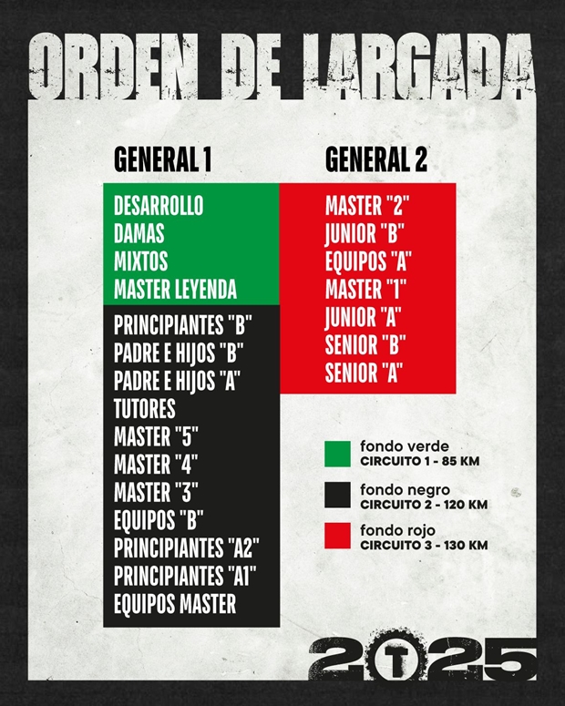 En las últimas horas se publicó el orden de largada y los respectivos circuitos, que tendrán las 22 categorías del Rally Transmontaña Copa Zavadivker, los próximos 21, 22 y 23 de Noviembre en San Pedro de Colalao, así como también se iniciaron los informes en vivo de los Miércoles por la noche, a través del Instagram oficial del evento, donde se comunican distintas novedades y se reciben consultas. Las categorías se dividen en tres grandes grupos de acuerdo al circuito que realizarán, en primer término largarán aquellas que realicen el trazado mas corto (85 kms.), identificadas con fondo verde en su numeración, posteriormente lo harán las que deban recorrer el trazado intermedio (120 kms.), con fondo negro en sus placas, la cuál a su vez compite por la General 1. Tras un breve intermedio, largarán finalmente las clases altas, identificadas con fondo rojo en su numeración, que deberán afrontar el trazado completo de 130 kilómetros de recorrido.